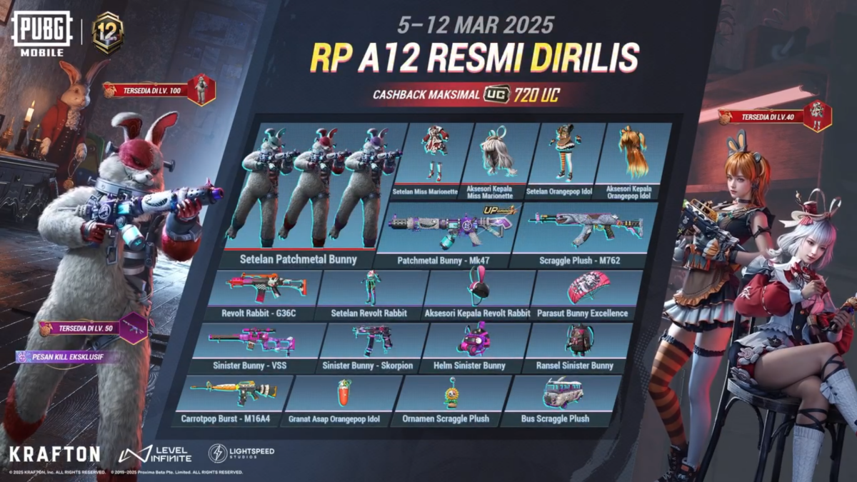 PUBG MOBILE baru-baru ini merilis Royale Pass Ace 12 (RP A12) dengan tema Twisted Parade, yang akan menyemarakkan kuartal pertama tahun 2025. Pemain dapat menikmati berbagai hadiah menarik termasuk Patchmetal Bunny Set, skin eksklusif, dan banyak hadiah lainnya hingga 7 Mei 2025.